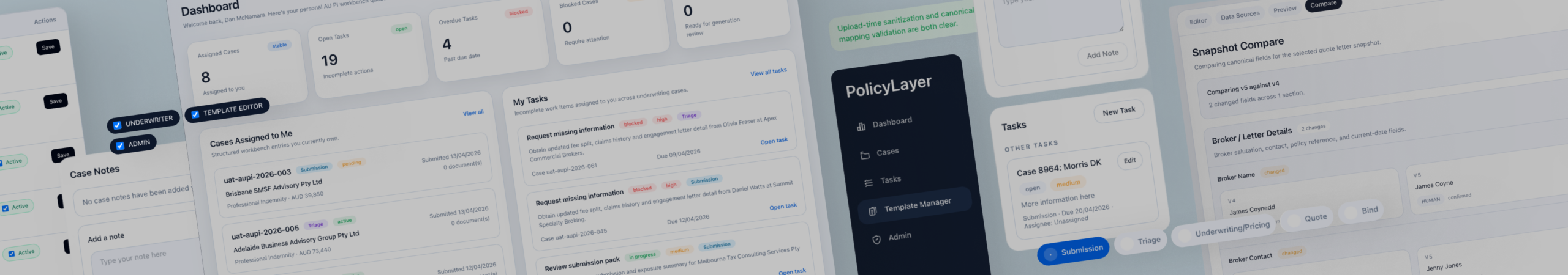 PolicyLayers makes for faster case handling, better data integrity, and full auditability—from submission through to bind and document issuance—while maintaining strict control over wording, branding, and compliance.